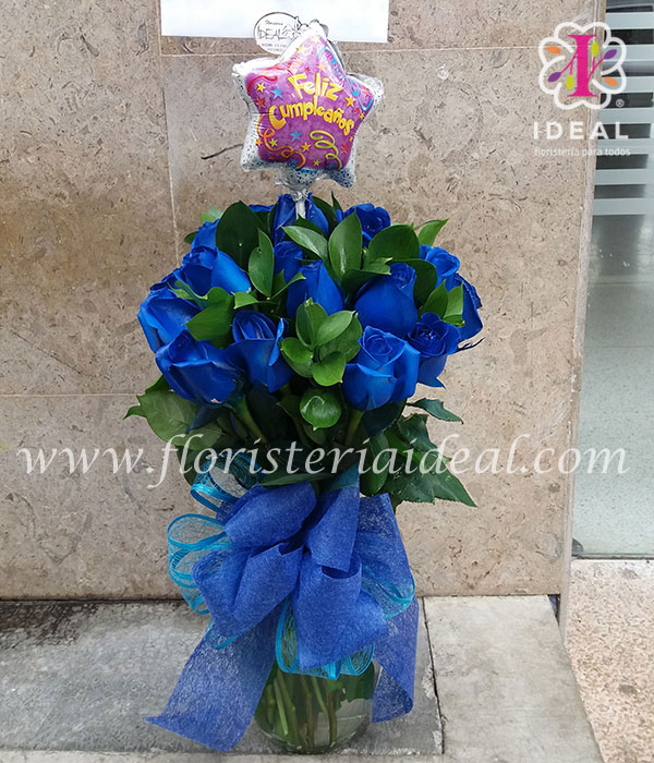 deslumbra los ojos de tu linda chica con este lindo regalo floral elaborado en hermosas rosas azules y tiernos follajes verdes esta acompañado de linda base de vidrio y elegante lasito . incluye tarjeta para esta linda ocasion.
