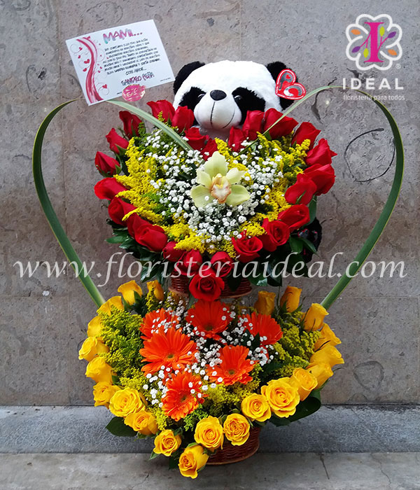 ilumina los ojos de tu linda dama con esta bella creacion elaborada en hermosas rosas,rojas y amarillas lindas gerberas y tierna orquidea su forma son dos corazones y esta acompañado de lindo osito panda y linda tarjeta a computador con expresivo mensaje