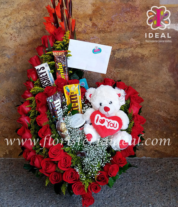 ilumina los ojos de tu linda dama con este hermoso arreglo floral elaborado con hermosas rosas y rica variedad de chocolates mas tierno peluche. especial para que celebre el mas lindo dia de tu aniversario .