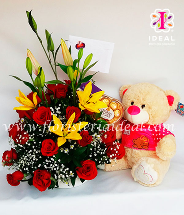 Celebra el dia de tu aniversario con este sensacional arreglo floral elaborado en hermosas rosas, lirios y deliciosos chocolates esta acompañado de tierno oso de peluche y delicados follajes. su base es de cerámica. incluye tarjeta para la ocasion.