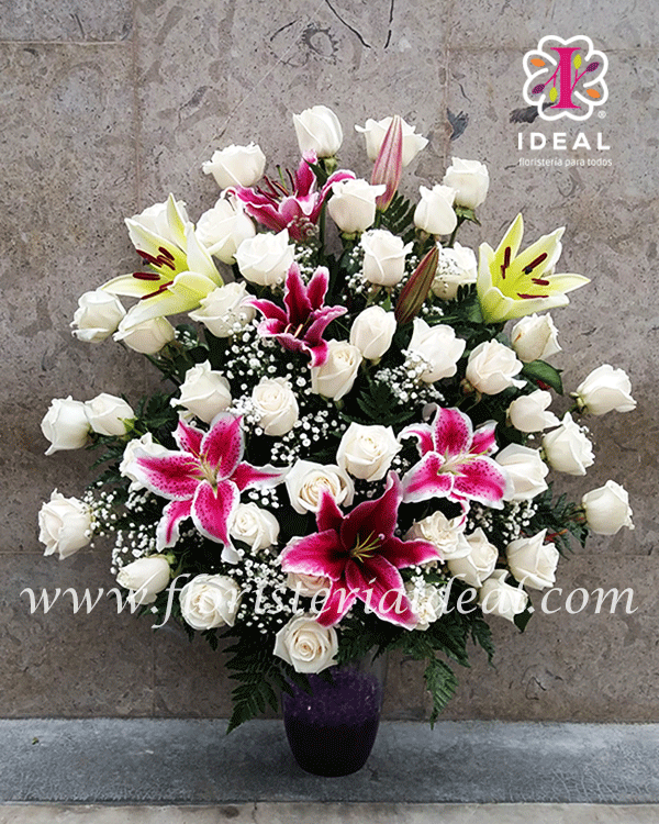 lindo arreglo floral elaborado en hermosas rosas y bellos lirios su base es un jarrón de vidrio y lo acompaña una linda tarjeta para la ocasion especial para un lindo aniversario recuerda que las rosas blancas reflejan pureza.