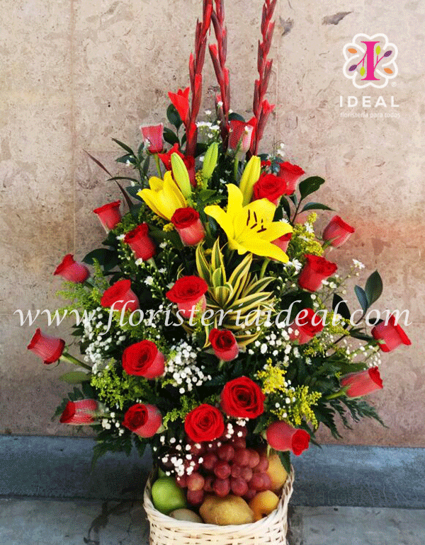 sorprenda a tu ser amado el dia de tu aniversario con este bonito regalo floral acompa?ado de deliciosas frutas