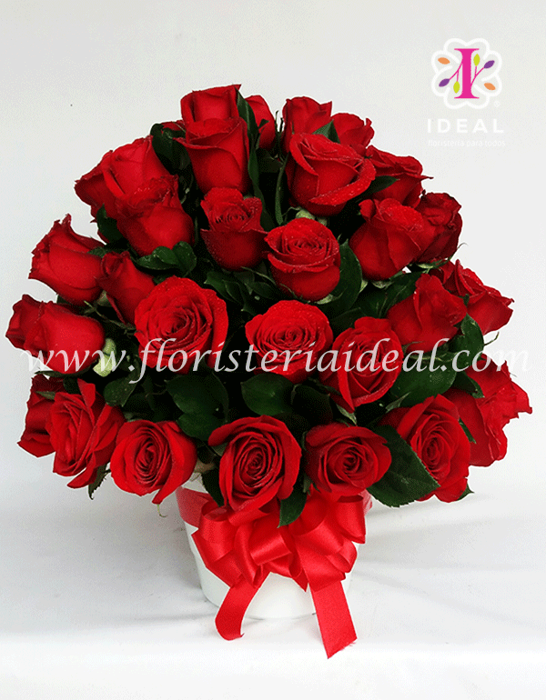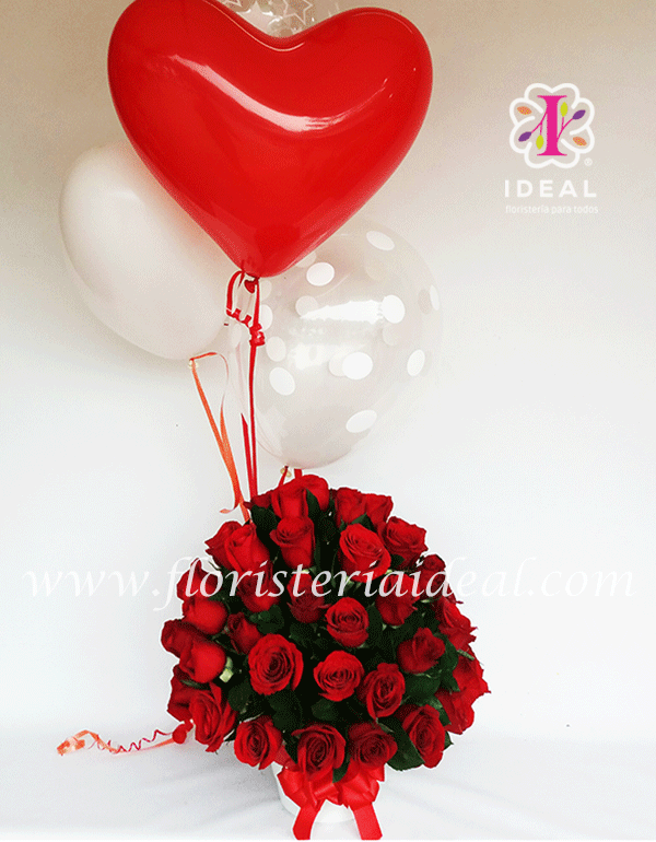 delicado y especial arreglo floral elaborado en bellas rosas rojas y tiernos follajes verdes especial para regalar el dia de tu aniversario. incluye tiernos globos en helio para acompaña este elegante arreglo y tarjeta para la ocasion cantidad de rosas 50 unidades y su forma es redonda