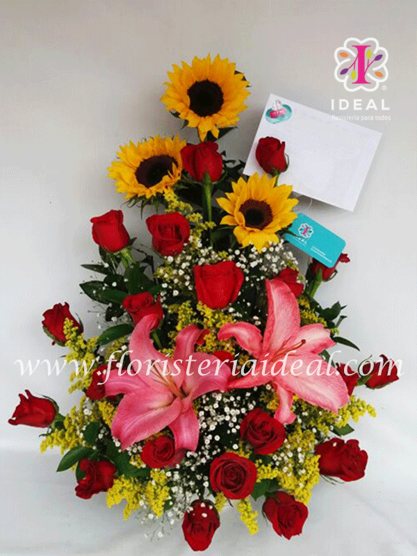 Llindo arreglo floral para regala el dia de tu cumplemeses con tu paraeja esta elaborado con bellas rosas,girasoles,lirios y follajes y lo acompaña una bonita tarjeta.