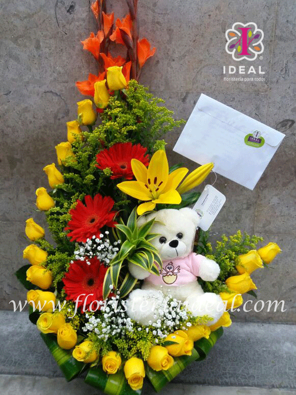 Delicado arreglp floral elaborado en bellas rosas gerberas y lirios acompa?ado de tierno oso de peluche y tarjeta a computador