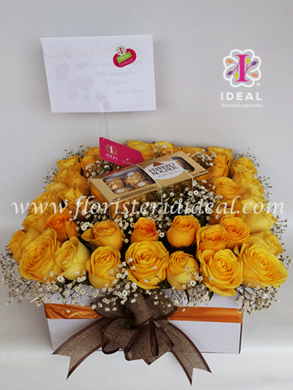 Especial arreglo de rosas y bellos follajes blancos decorada en caja acompañado de ricos chocolates ferreros rocher y tarjeta la ocasión. tiene 40 unidades de rosas ( El cliente puede escoger el color de las rosas es al gusto)