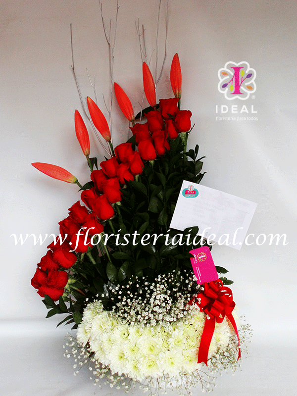 Bello arreglo floral elaborado en linda rosas, lirios, pompones y follajes verdes lo acompa?a una tierna tarjeta para la ocasi?n.