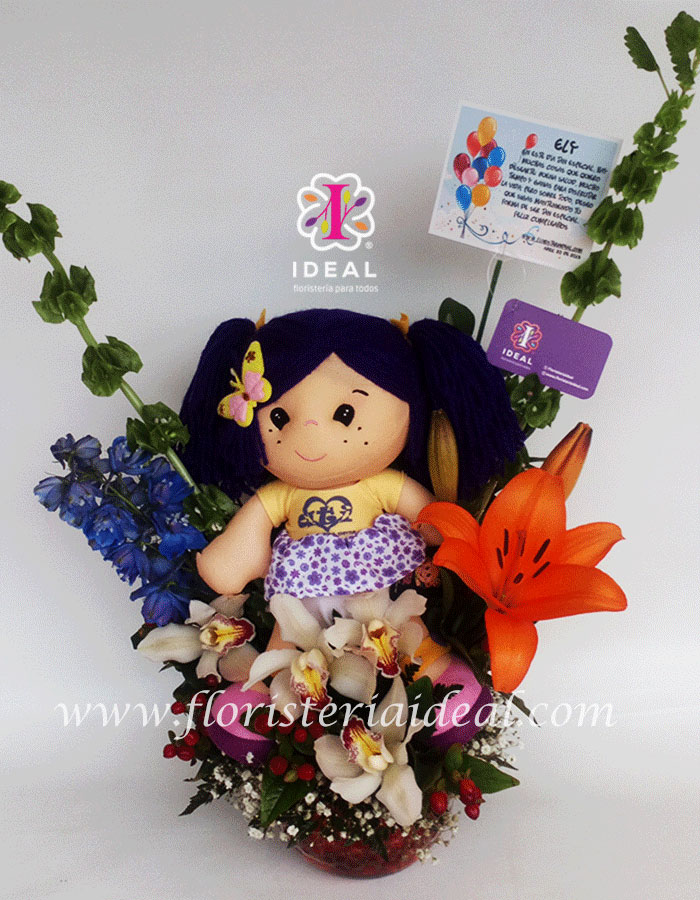 Delicado arreglo floral elaborado con hermosas flores como orquídeas, lirios, delfinios, y delicados follajes esta acompañado de tierna muñeca ati original y linda tarjeta para esta bonita ocasión.