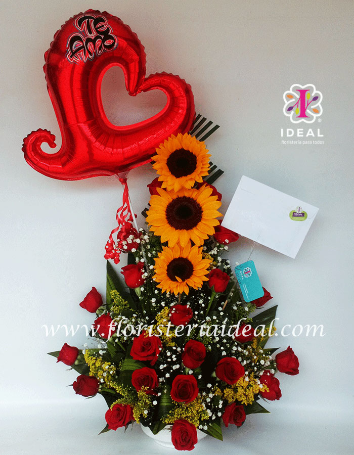 Bello arreglo de girasoles y hermosas rosas rojas, esta acompañado de globo en forma de corazón y tierna tarjeta para esta linda ocasión.