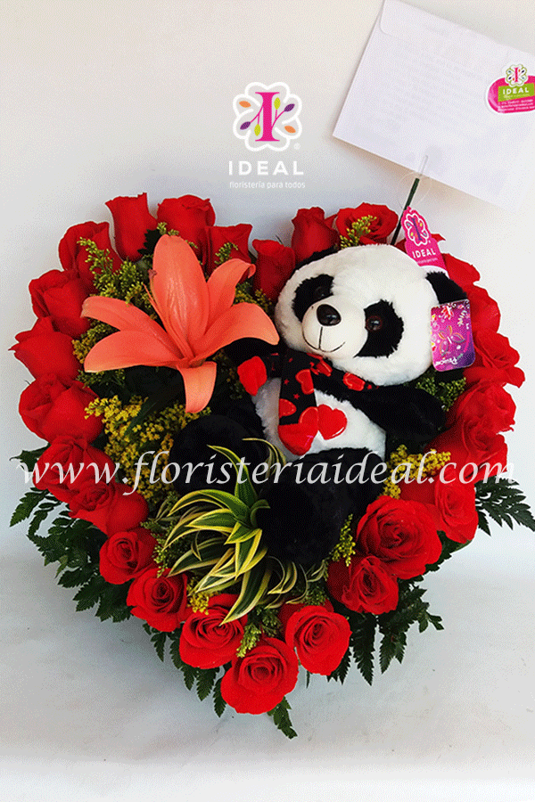 Tierno corazón de rosas y bello peluche panda