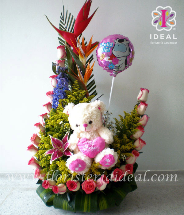 hermoso arreglo floral en forma de caracol acompañado hermoso peluche mas globo