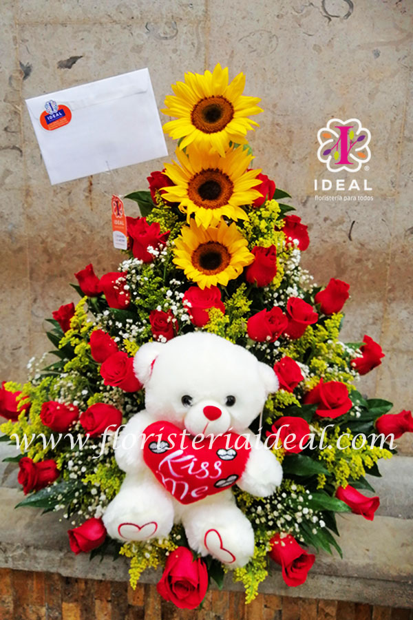 Bello arreglo floral elaborado en delicadas rosas y lindos girasolesacompañado de bellos follajes y tierno peluche incluye tarjeta para la ocasión.