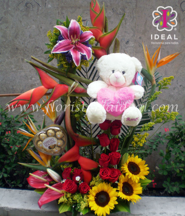 Un aniversario es una bella ocasión para entregar los detalles mas hermosos, tu pareja sonreirá con este lindo arreglo de girasoles, surco en rosas, lirios, iliconias, aves de paraiso, anturios, chocolates y un osito de peluche.