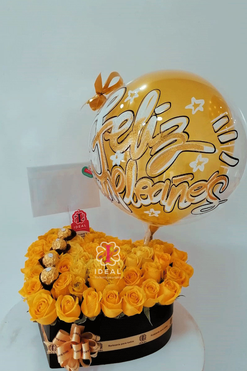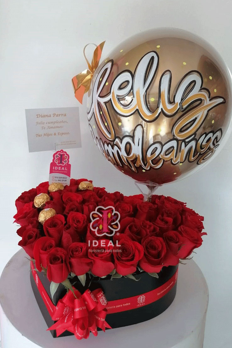 Hermoso arreglo de rosas en forma de corazón, acompañado de globo personalizado, Chocolates Ferreros Rocher y hermosa tarjeta para la ocasión.Cantidad de rosas: 40 unidades