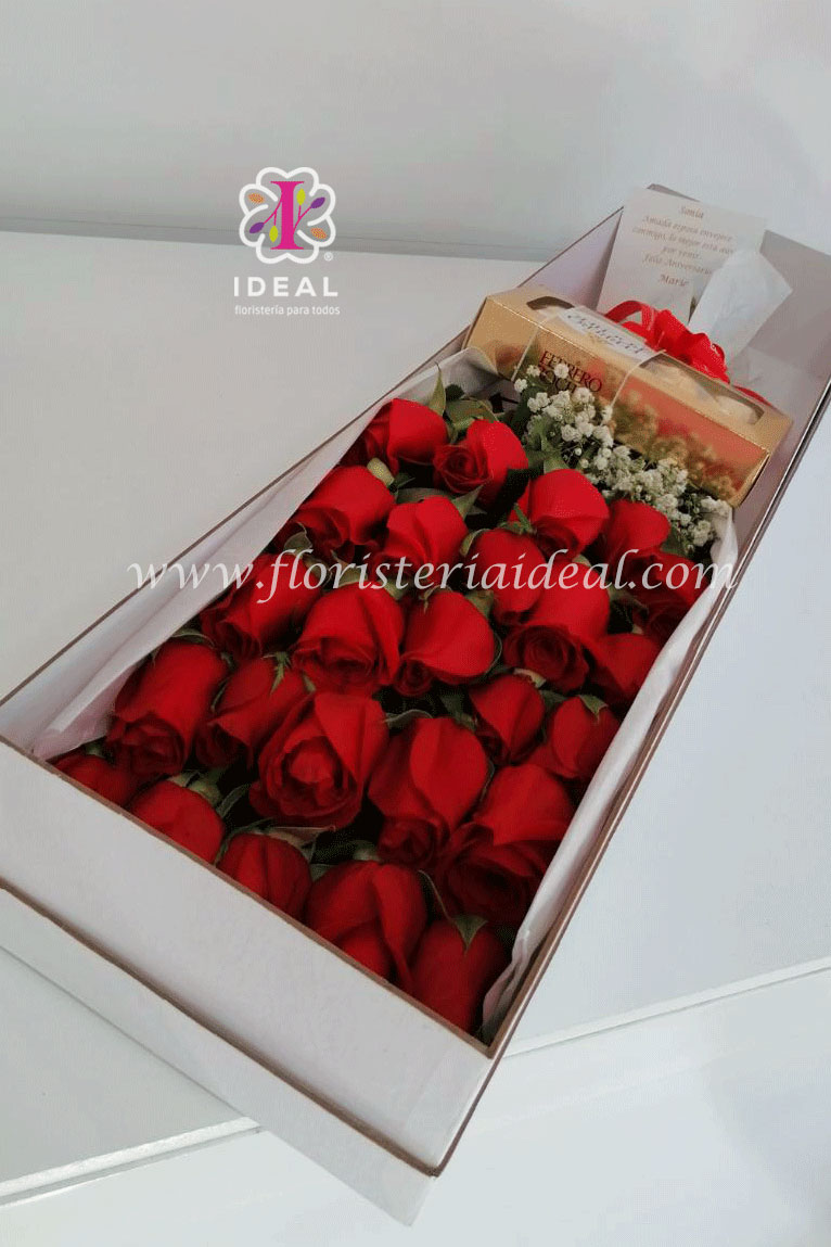 Linda caja alargada de rosas acompañada de follaje blanco y chocolates Ferrero Rocher.Cantidad de Rosas: 25