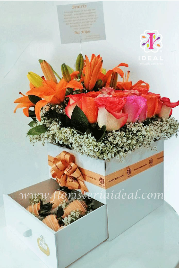 Arreglo floral elaborado en bellas rosas y lirios, acompañado de delicado follaje blanco y fresas de chocolates, su base es una linda caja de madera con cajón