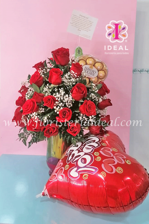 Hermoso arreglo floral elaborado en bellas rosas rojas, su forma es redonda y su base es de vidrio tipo samaritano, viene acompañado por globo metalizado personalizadoCantidad de Rosas: 50