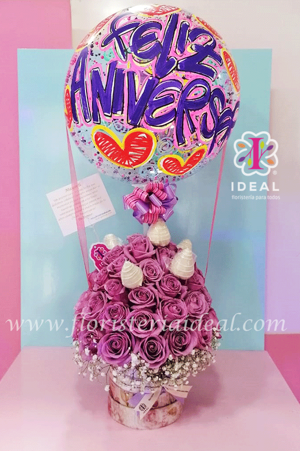 Caja de rosas acompañada por Globo burbuja personalizado, incluye 5 fresas de chocolateCantidad de Rosas: 50 unidades