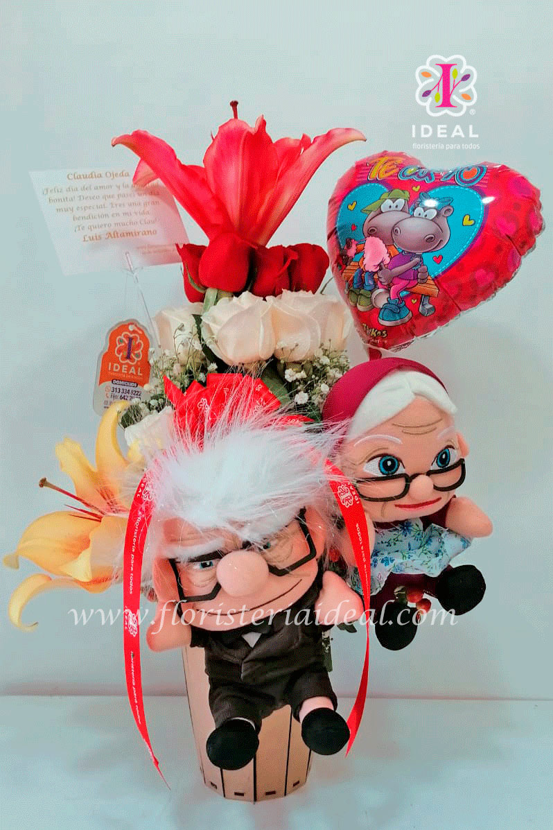 Bello arreglo floral elaborado lindas rosas y delicados lirios, acompañado por tierna pareja de abuelos y globo metalizado, incluye tarjeta para la ocasión.
