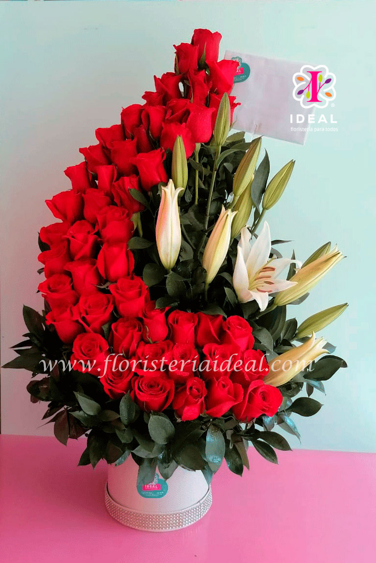 Delicado arreglo floral elaborado en bellas rosas, lirios y hermosos follajes verdes esta acompañado de linda tarjeta para esta ocasión.