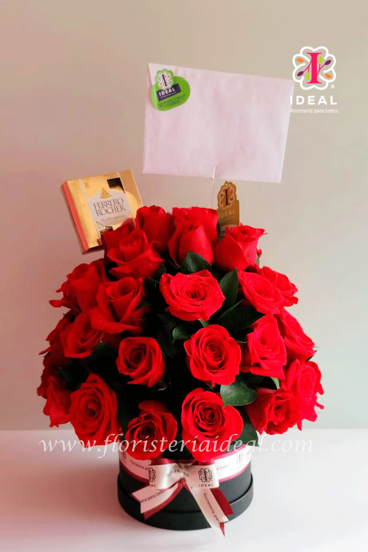 Linda caja de rosas rojas acompañada por deliciosos chocolates ferreros y tarjeta para la ocasión.
