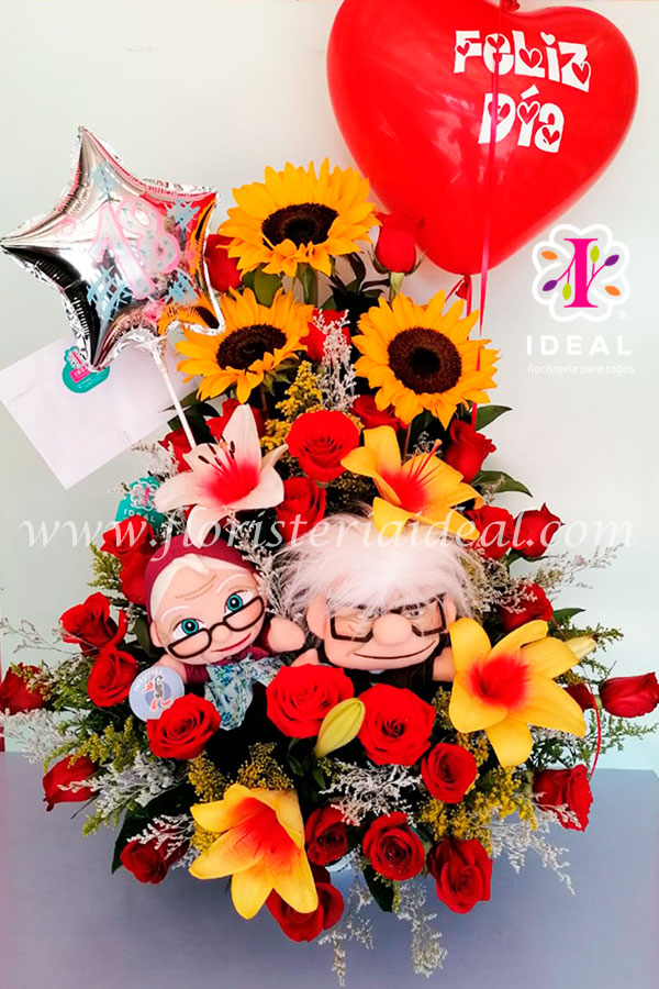 Espectacular arreglo de rosas rojas, girasoles y lirios, acompañado de 2 peluches de abuelos up, globo metalizado pequeño, globo en helio y tarjeta para la ocasión.