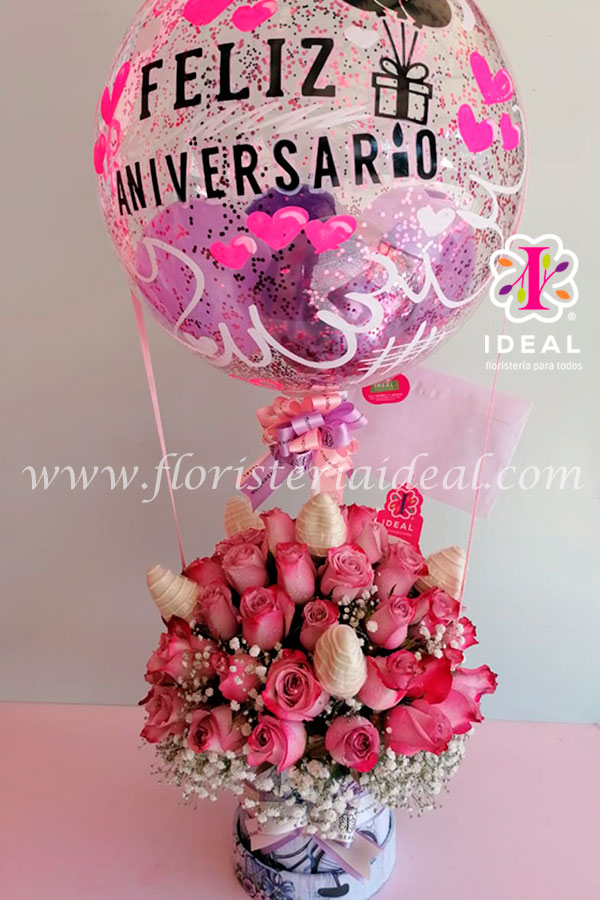 Espectacular arreglo floral elaborado en delicada caja estampada, acompañadas de deliciosas fresas bañadas en chocolate, tarjeta para la ocasión y globo sintético decorado y personalizado .