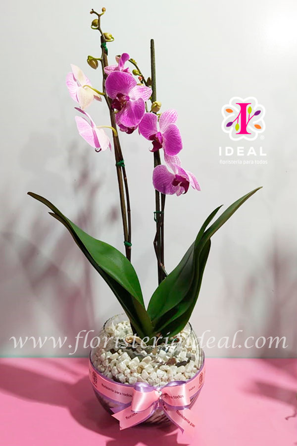 Delicada orquídea decorada en bella Pecera con lindas piedritas blancas y lo acompaña una tarjeta personalizada para la ocasión.