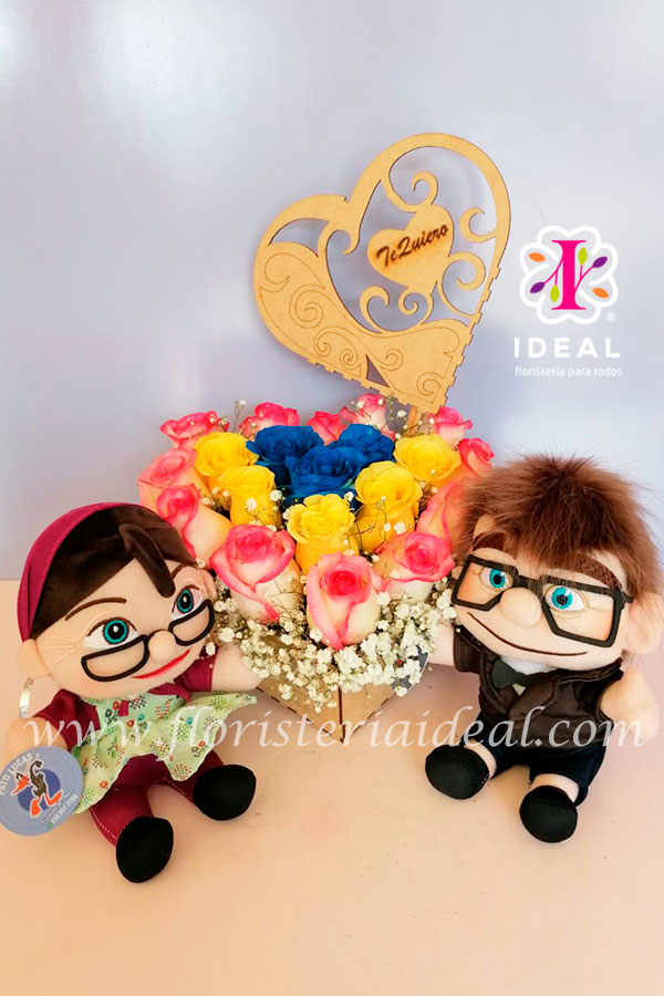 Bello arreglo floral elaborado en caja de corazón con bellas rosas Bush, Amarillas y Azules, acompañado de lindos peluches de abuelitos #abuelos #Up Acompañado de tarjeta para la ocasión.
