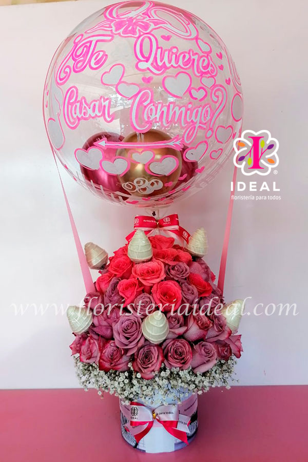 Delicado arreglo floral elaborado en bellas rosas lilas acompañado de fresas bañadas en chocolate, globo sintetico personalizado y tarjetas para la ocasión.