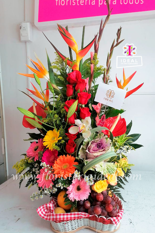 Delicado arreglo floral, elabora en bellas flores silvestres surtidas acompañado de canasta de frutas y tarjeta para ocasión.