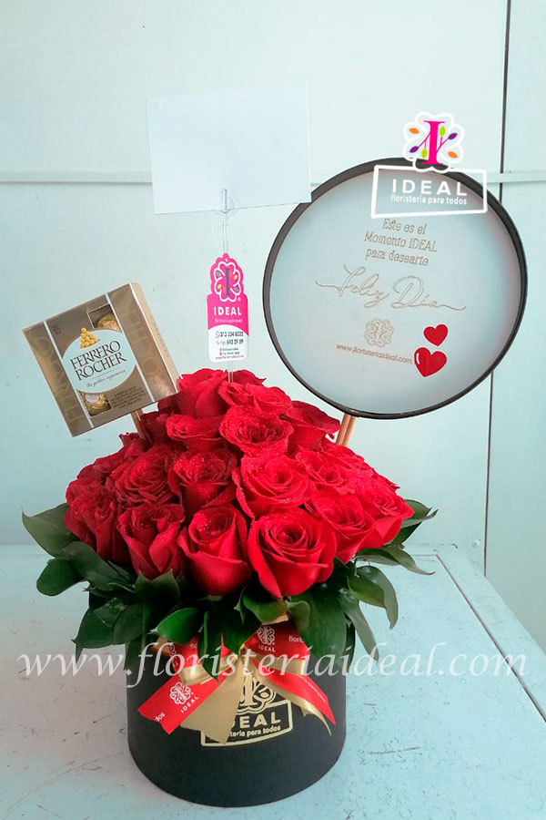 Delicado arreglo de rosas rojas en caja personaliza , acompañada de chocolates y tarjeta para la ocasión