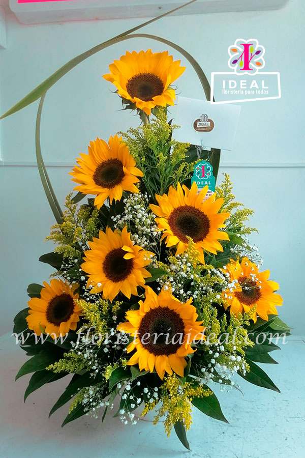 Delicado y bello arreglo de Girasoles en forma de pirámide, acompañada de hermosa tarjeta para la ocasión.