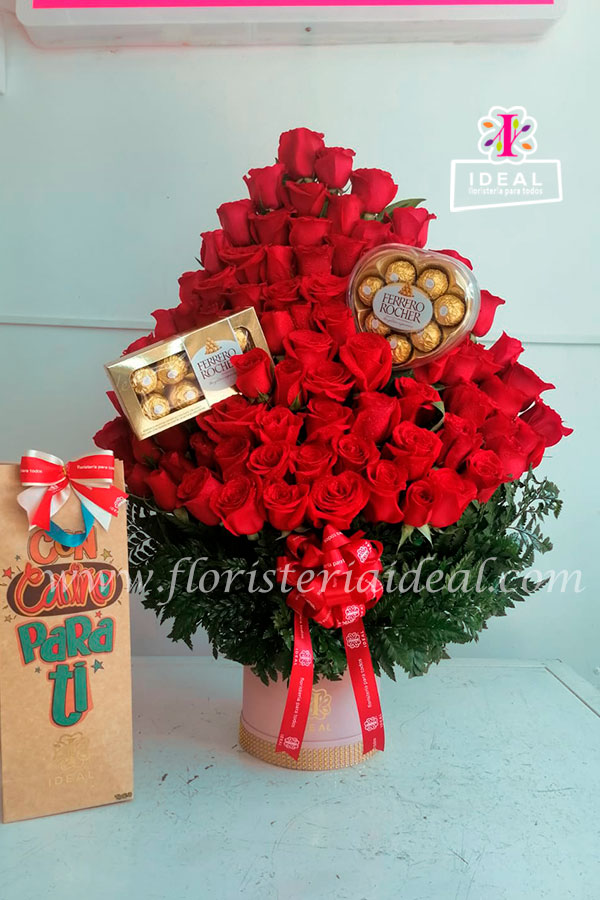 Especial arreglo floral elaborado en bellas rosas rojas acompañado de de deliciosos chocolates mas botella de vino dubonnet incluye tarjeta para la ocasión.