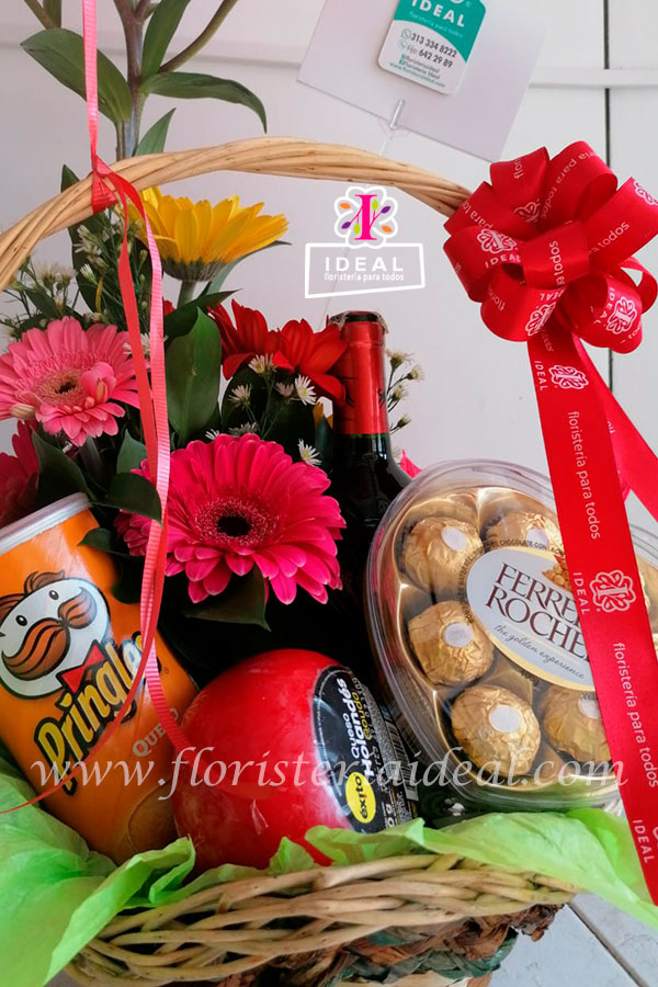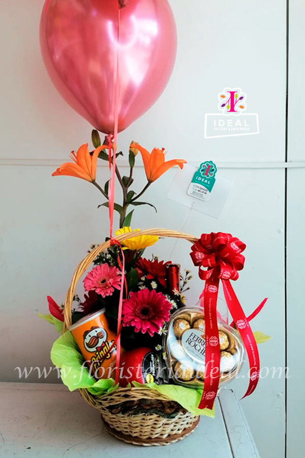 Bella canasta de flores acompaña de ricos productos como vino chileno cabernet suaviñon, chocolates Ferreros en estuche corazón, papas Pringles, queso gouday, copa de vidrio mas globos helio y tarjeta para la ocasión.