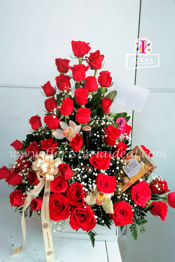 Bello arreglo de rosas acompañado de crema de bailéis y chocolates ferreros incluye tarjeta para la ocasión