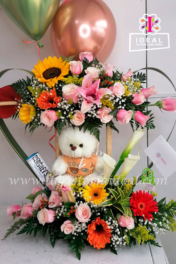 Delicado arreglo floral elaborado en bellas rosas tono pastel acompañado de flores exóticas y tierno peluche mas globos en helio y tarjeta para la ocasión.