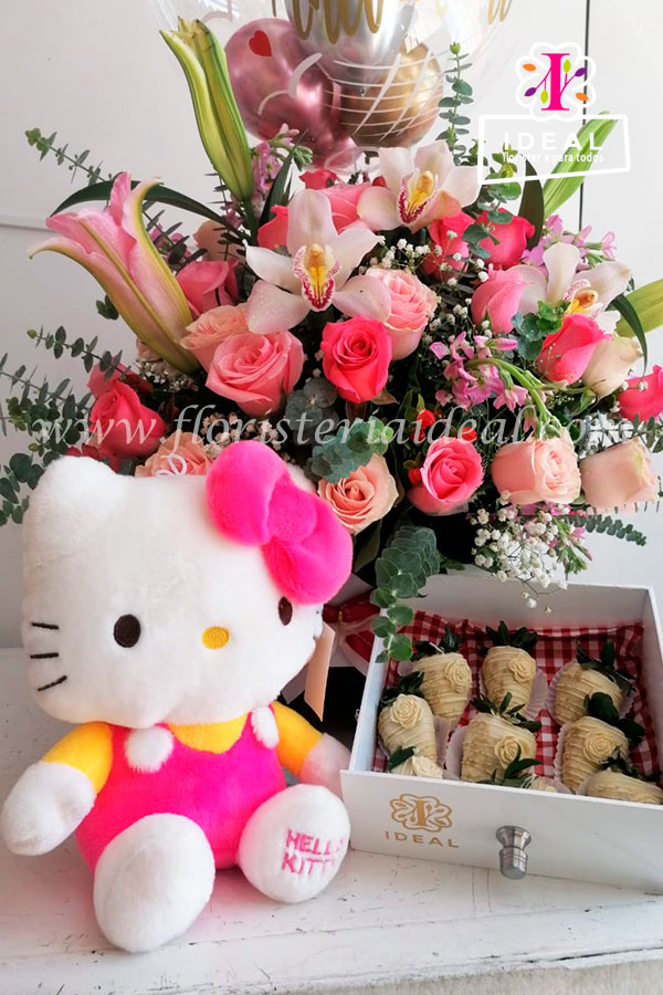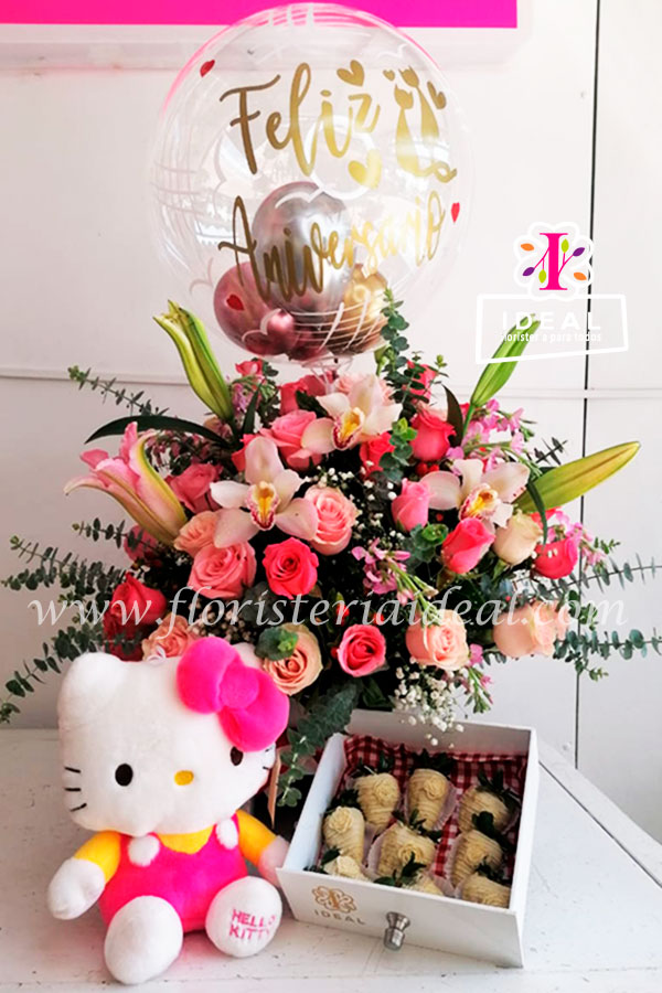 Especial arreglo floral elaborado en bellas flores surtidas, lirios, rosas, orquídeas y delicados follajes incluye lindo peluche mas ricas fresas, globo burbuja personalizado y tarjeta para la ocasión.