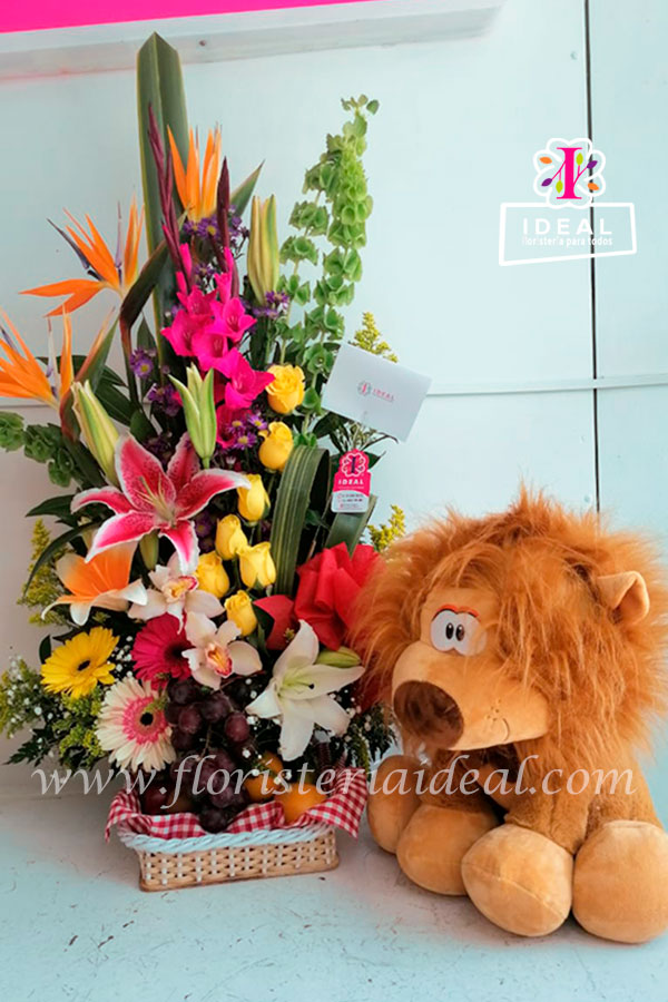 Delicado arreglo floral elaborado en bellas flores exóticas acompañada en una canasta de deliciosas frutas y peluche antialérgico