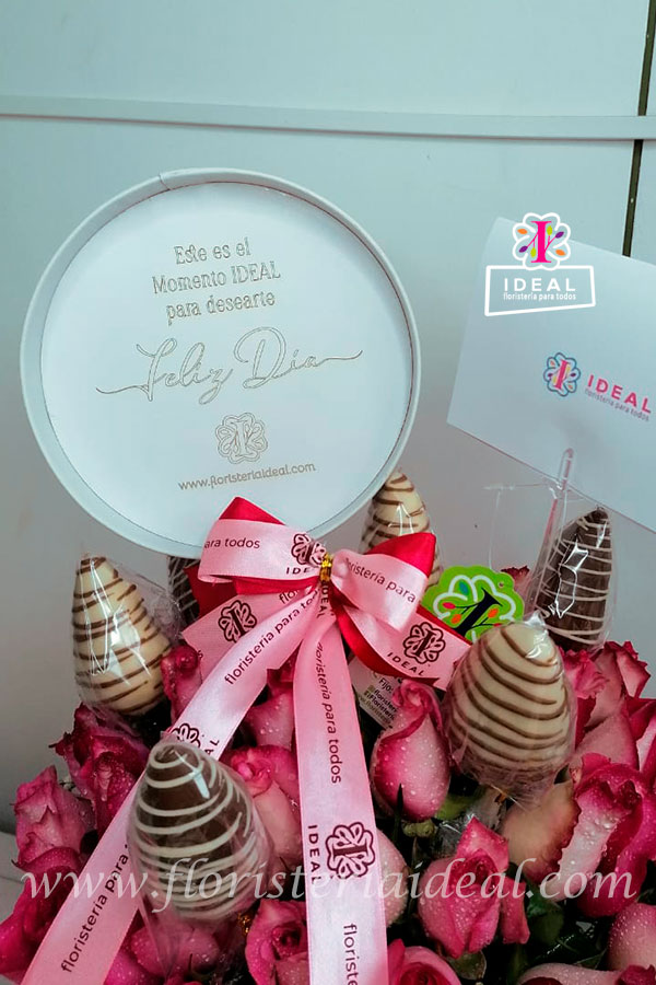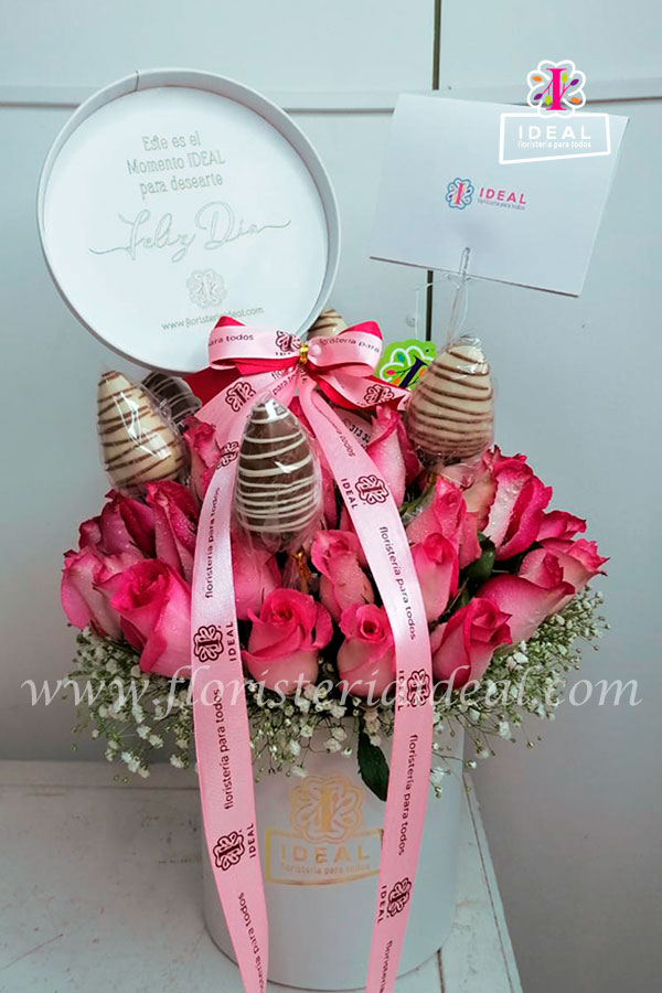 Delicada caja de rosas acompañada de fresas bañadas en delicioso chocolate con hermoso mensaje para la ocasión.