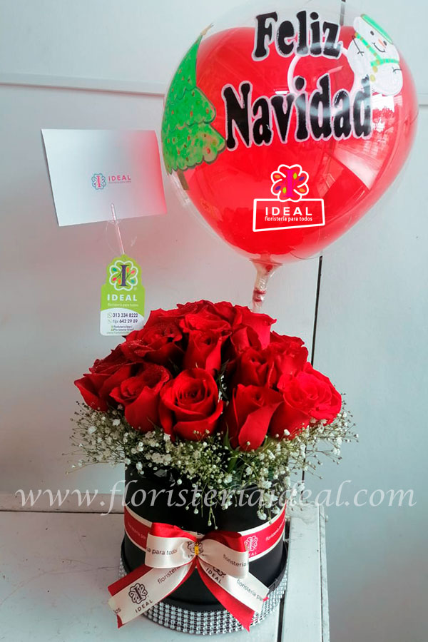 Caja de rosas acompañado de globo con mensaje para la ocasión.