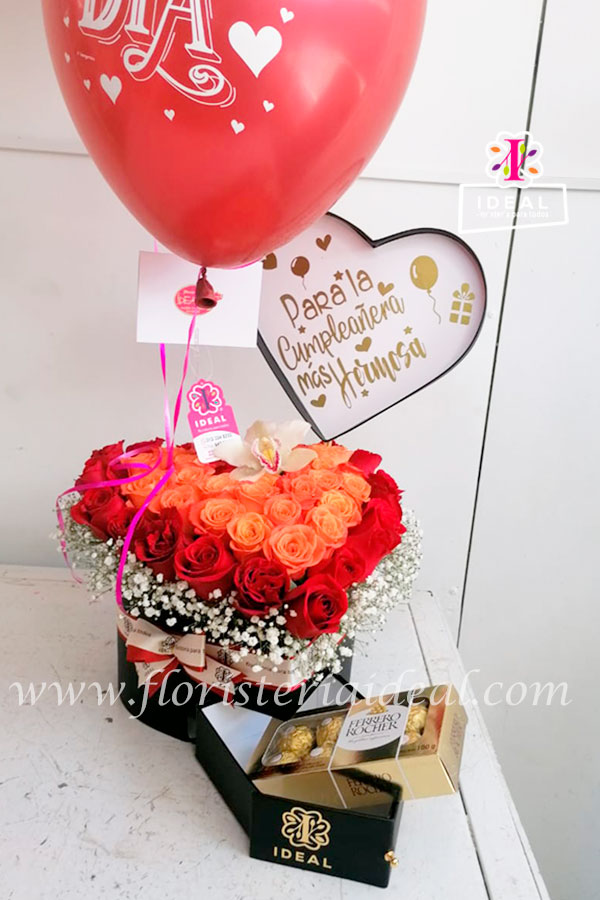 Arreglo floral en dos tonos de rosas elaborado en delicado Baúl de corazón acompañada de deliciosos chocolates Ferrero Rocher y hermoso globo y tarjeta para la ocasión