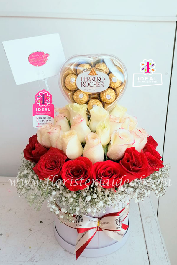 Arreglo de dos tonos de rosa elaborado en una delicada caja acompañado de deliciosos chocolates Ferrero Rocher y tarjeta para la ocasión
