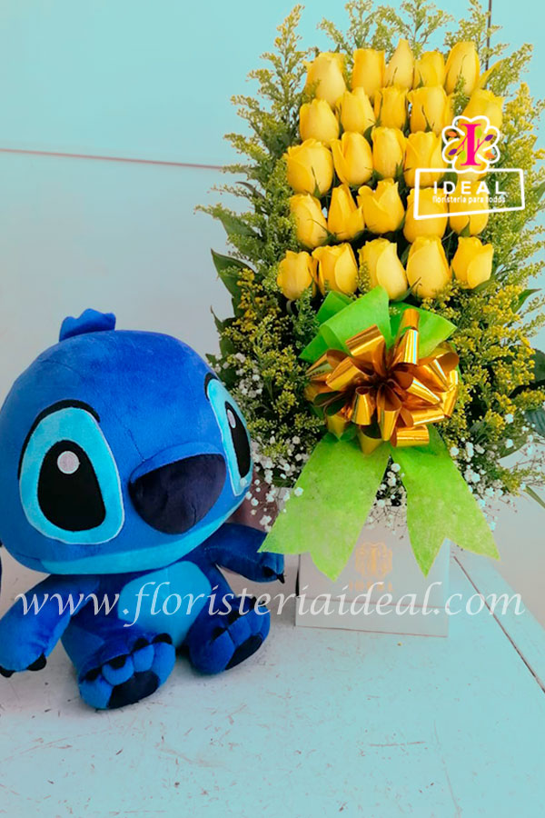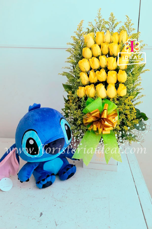 Arreglo de rosas amarillas y follaje en forma de escalera acompañado de hermoso peluche antialérgico en forma de Stitch