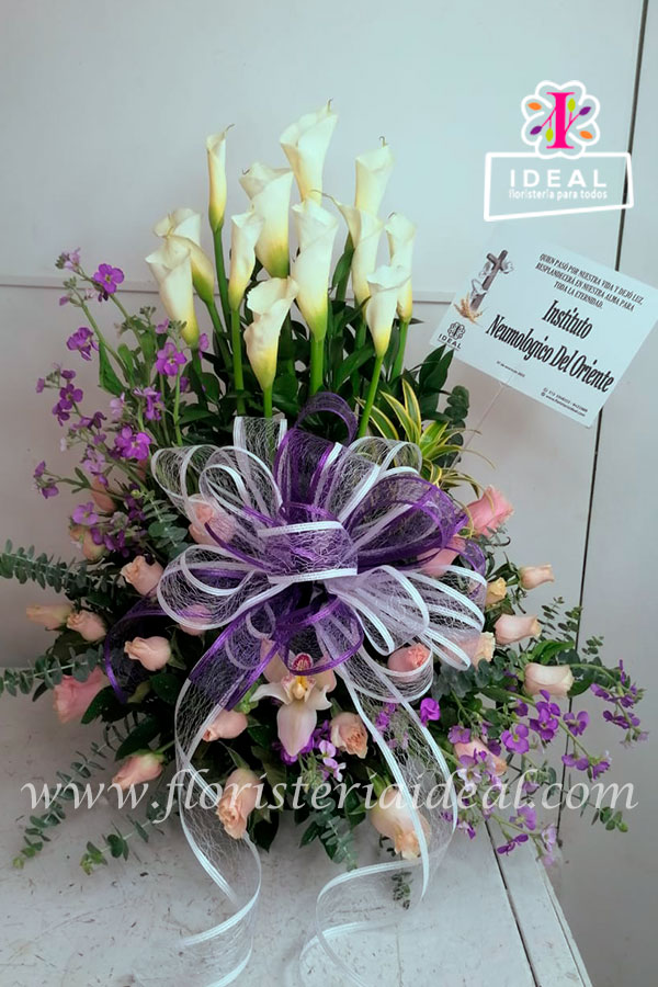 Arreglo fúnebre en rosas y cartuchos acompañado de delicados lirios y tarjeta