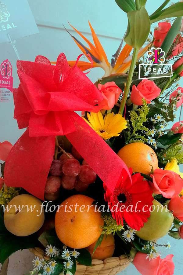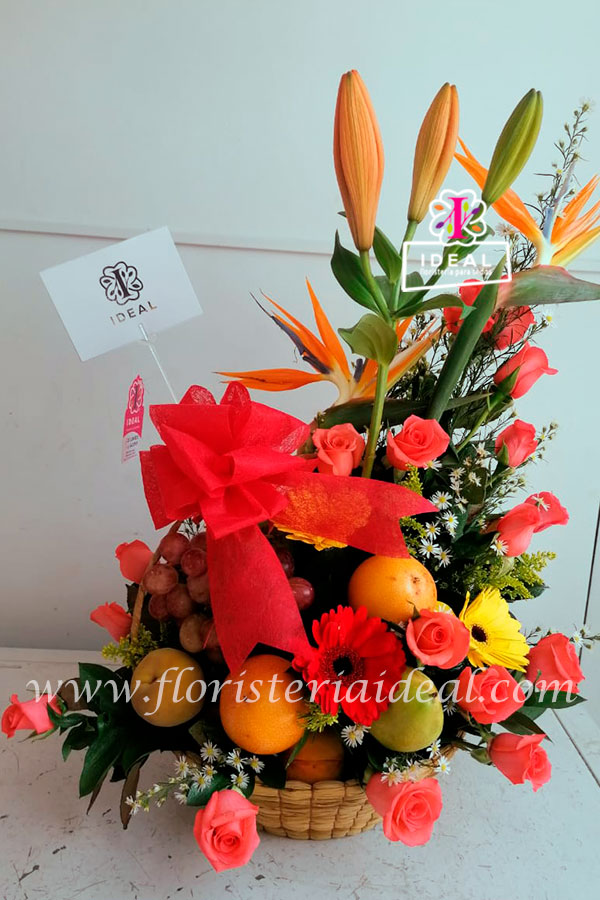 Bello arreglo floral decorado en lindas rosas. Está acompañado de deliciosas y frescas frutas. Incluye tarjeta para la ocasión.