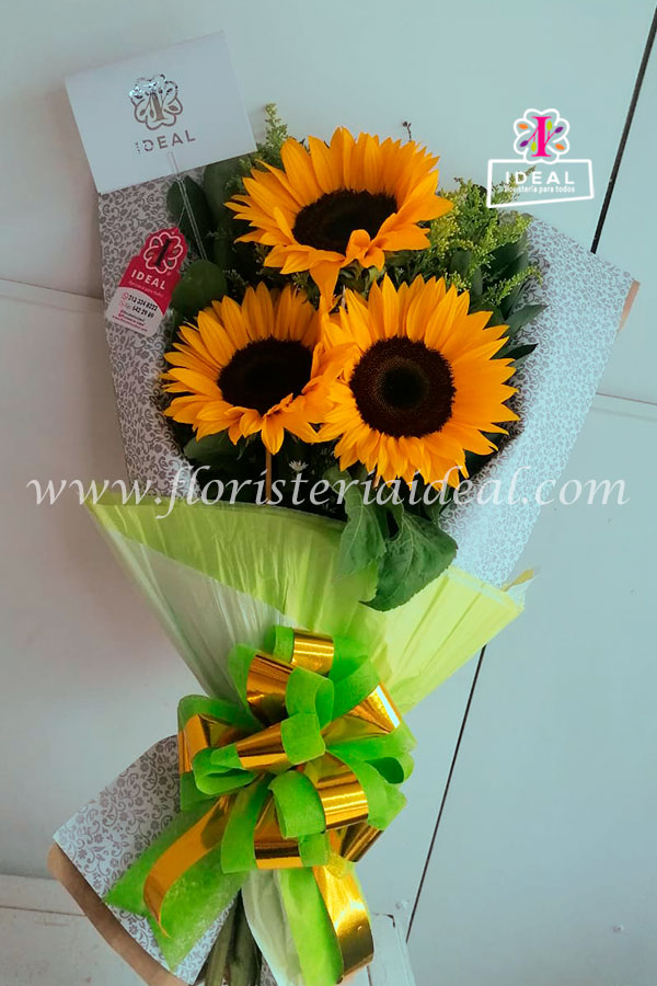 Lindo arreglo floral tipo buquet decorado con girasoles y follaje verde.