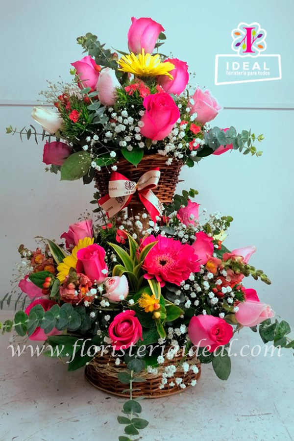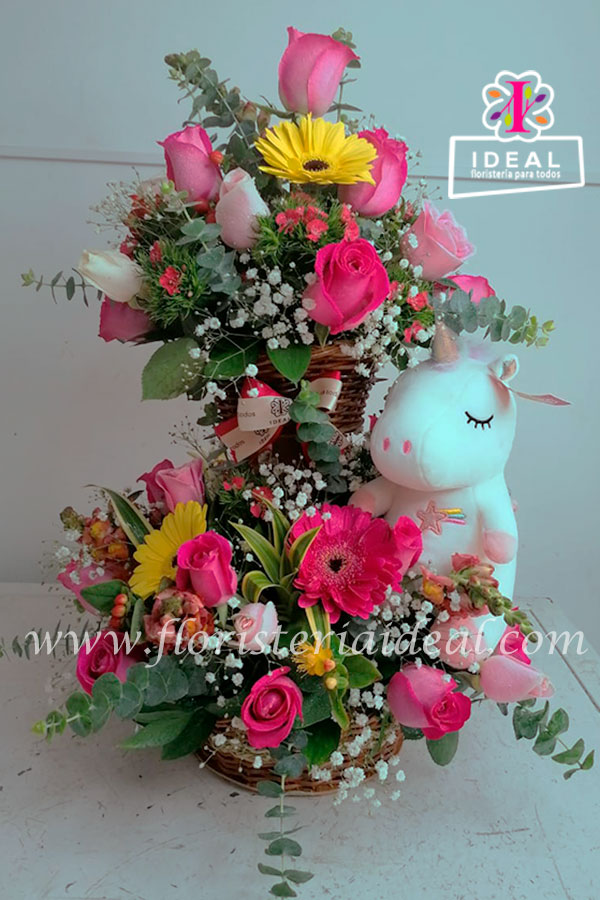 Delicado arreglo floral elaborado en bellas flores tropicales de dos pisos. Incluye hermosa canasta, peluche y tarjeta para la ocasión.