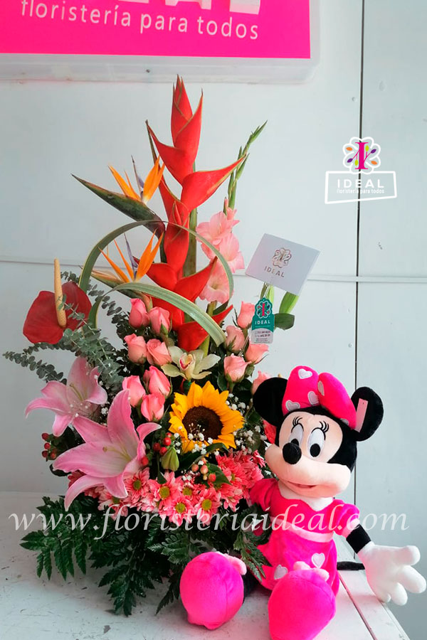 Delicado y bello arreglo floral elaborado en bellas rosas rosadas, margaritas y un girasol, acompañado de lindo peluche de Minnie Mouse.