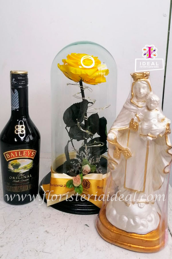 Hermosa y delicada rosa Inmortalizada de color amarillo, acompañada de imagen de la virgen maría y botella de crema de Whysky Bayley de 375mL